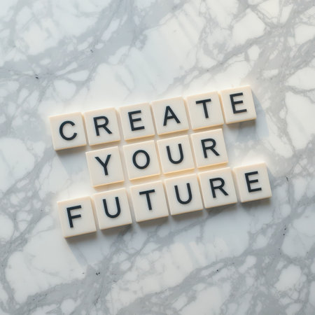 An inspiring flat lay arrangement of letter tiles spelling Create Your Future on a beautiful marble surface, symbolizing personal growth and motivation.