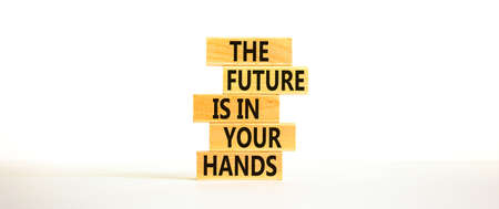 The future is in your hands symbol. Concept words The future is in your hands on wooden blocks on a beautiful white table white background. Copy space. Business and future in your hands concept.