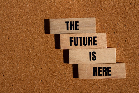 The future is here message written on wooden blocks on brown background. Conceptual the future is here symbol. Copy space.