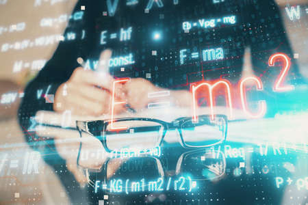Double exposure of formulas sketch hologram and woman holding and using a mobile device. Education concept.