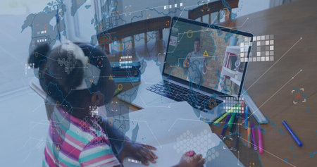 Writing African American girl wearing headphones at desk by window with laptop showing teacher. Education, e-learning, remotelearning, digitalcommunication, homeschooling, creativelearning, interactive