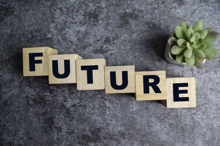 Concept of The wooden Cubes with the word Future on wooden background.