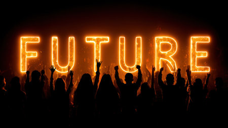 Silhouettes of people celebrating with raised hands in front of glowing letters spelling FUTURE, symbolizing hope and aspirations for what lies ahead