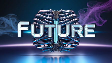 Future technology 3d illustration. Futuristic cyberpunk metal mannequin head with text future