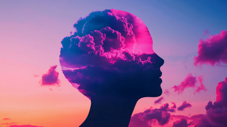 A creative double exposure silhouette of a person's head in profile. The form is filled with a textured, colorful cloudscape of pink, purple, and blue hues.