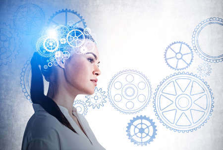 An abstract scene showing a brain with parts of gears and cogs visible through semitransparent areas