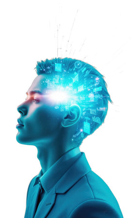 A businessman sporting a digital brain interface symbolizes the fusion of tech-intelligence and decisive thinking within a high-tech corporate setting