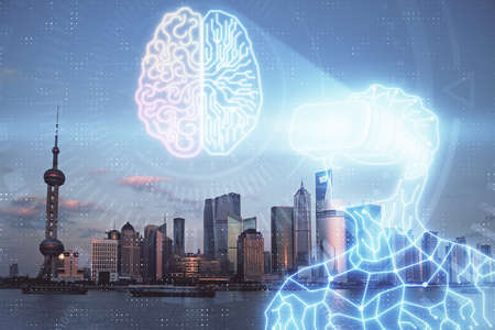 Brain hologram drawing on cityscape background multi exposure. Ai in modern city concept.