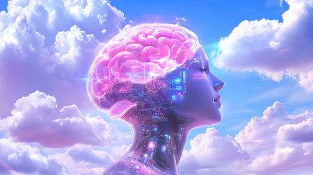This stunning image showcases a futuristic representation of a human brain merging with digital elements against a backdrop of clouds, symbolizing creativity and innovation.