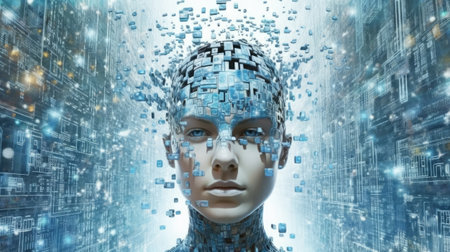 Digital Avatar Dissolving into Binary Data, Representing Future Technology and AI Transformation