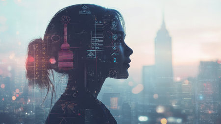 A silhouette of a woman gazes thoughtfully towards a city skyline at twilight, layered with digital graphics representing technology and data, reflecting innovation.