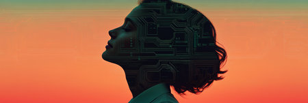 close-up of a person's face with a digital circuit board overlay