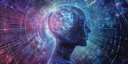 Abstract profile of a human head and consciousness with physical and chemical structures in the head, Person creative mind, Psychic waves concept, Generative AI illustration