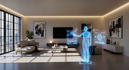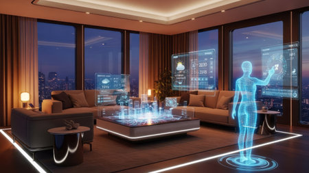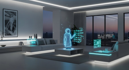 This image showcases a modern interior design featuring holographic displays and a central interactive element. The composition uses soft lighting and a cool color palette. It presents a futuristic ambiance suggesting advanced technology and potential applications in home automation or architectural visualization. It could be used for conceptual design or illustrating innovation.