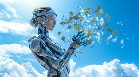 futuristic robotic figure with a human-like face and mechanical hands, gently interacting with a branch that has leaves and flowers, set against a clear blue sky with fluffy clouds
