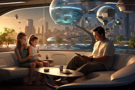 A pair of people sitting on a couch in a well-lit room, enjoying each others company, A futuristic family enjoying a smart-home life, AI Generated