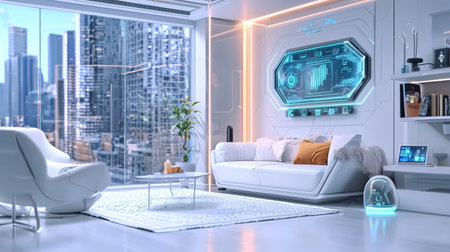 A modern futuristic living room featuring smart technology and sleek design. Large windows offer breathtaking urban views, enhancing comfort and sophistication.