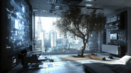 A stunning futuristic living space featuring a central tree and a panoramic city view. The design blends natural elements with sleek technology, creating a serene and innovative atmosphere.