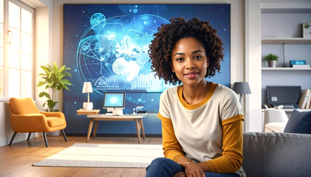 african american woman looking at camera in living room with financial charts