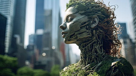 An AI generated illustration of a metallic figure stands in the bustling cityscape, its body covered in a layer of moss