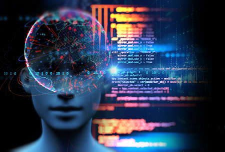 Abstract background of cyborg face and technology.Big data and learning machine.3d illustration.