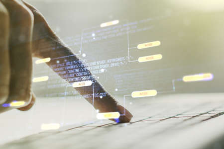 SEO optimization. Modern tech. PHP syntax highlighted. Writing programming functions on laptop. Big data and Internet of things trend.