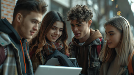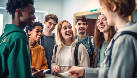 Generative AI : Diverse college students standing together in university campus Multiracial teenagers chatting and laughing outdoors Life style concept with guys and girls going