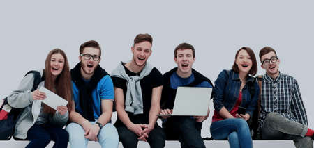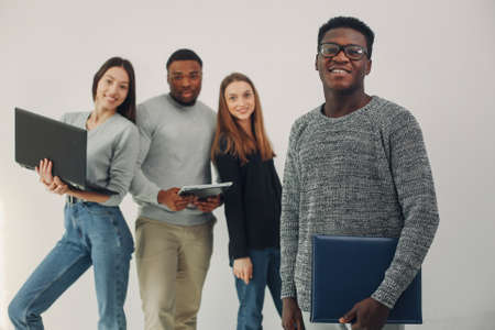 A group of young people standing next to each other. Graduate students or high school study group photo.