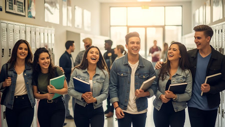 A group of happy students stands closely together their smiling faces brightening the school corridor during a busy day.