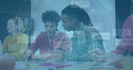 Image of data processing over diverse business people having meeting at office. Global business, finances and digital interface concept digitally generated image.