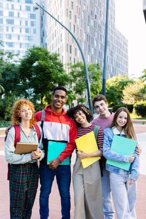 Enthusiastic group of friendly students standing together with notebooks and folders, exuding joy as they celebrate their academic journey and the