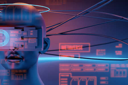 metaverse vr world simulation gaming cyberpunk style, digital robot ai, 3d illustration rendering, virtual reality device