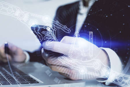Double exposure of technology sketch hologram and woman holding and using a mobile device. Ai concept