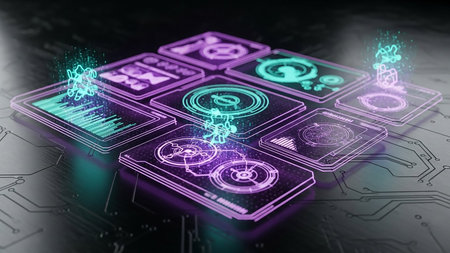 showing futuristic holographic interface with glowing purple and teal data visualizations and circuit board background, representing technology and...
