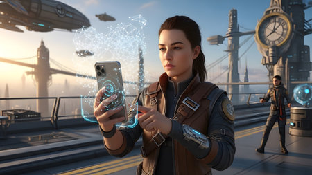 showing futuristic woman interacting with holographic network projection on smartphone in...