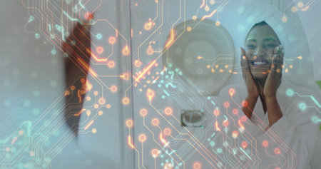 Smiling woman in bathrobe and towel pressing cheeks at vanity, with circuit overlay, copy space. Beauty, skincare, wellness, technology, futurism, relaxation, self-care