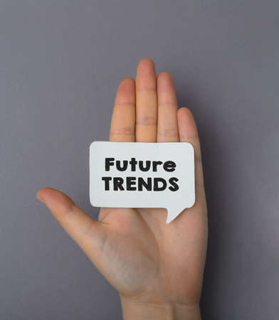 Future trends.Female hand on a gray background holds a card with text. Conceptual photo.