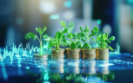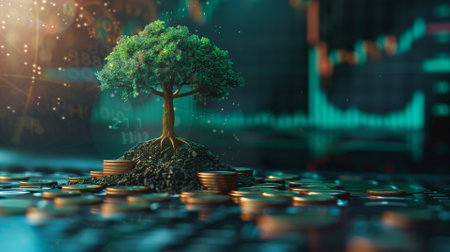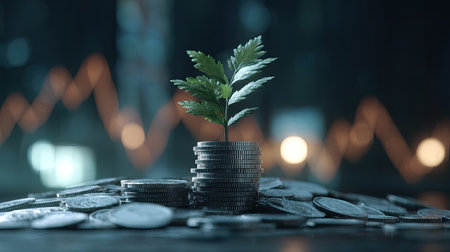 This striking image captures a young plant growing from a stack of coins, representing the concept of financial growth and investment opportunities in a contemporary business landscape.
