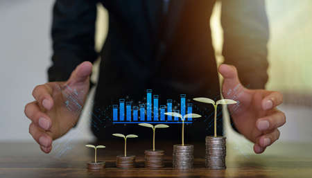 Concepts of economic technology future business Eco friendly new trading platform. Businessman with coin stack and hologram chart.