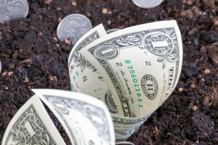soil and American dollars and coins that are stacked on the ground, closeup