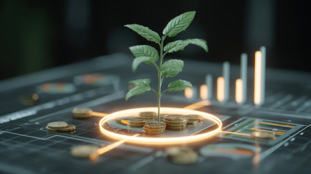 A vibrant green plant emerges from a pile of coins, symbolizing financial growth and investment opportunity against a backdrop of business charts and metrics.