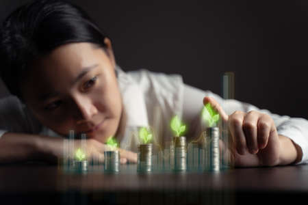 Asian business woman holding coin with tree growing to putting on stacking coin about finance and accounting while the idea of increasing profit from business investment