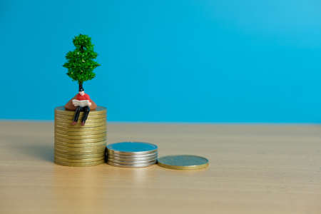 Miniature business concept - a young man reading on coin stack learning about financial