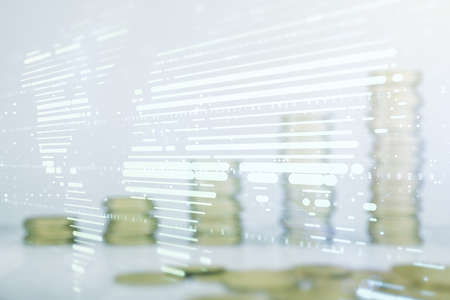 Double exposure of coins stacks with forex graph and cityscape background. Financial and trading concept.