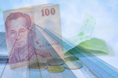 Double exposure of money coins and banknote with cityscape