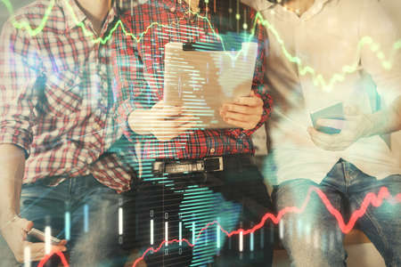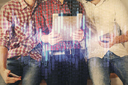 Double exposure of forex graph drawing and man and woman working together holding and using a mobile device. Trade concept.