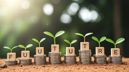 Concept of future investment with plants and coins stacked. Symbolizes financial planning, savings, growth, and prosperity for business success.