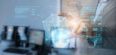 Businessman touching screen, pushing on a touch screen digital hi-tech technology design. concept innovation.