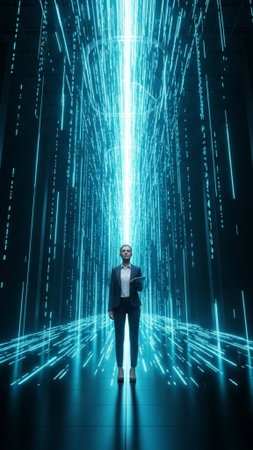 Businesswoman standing in front of a futuristic blue background with binary code