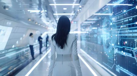 Businesswoman in corridor of modern office building with digital hologram.